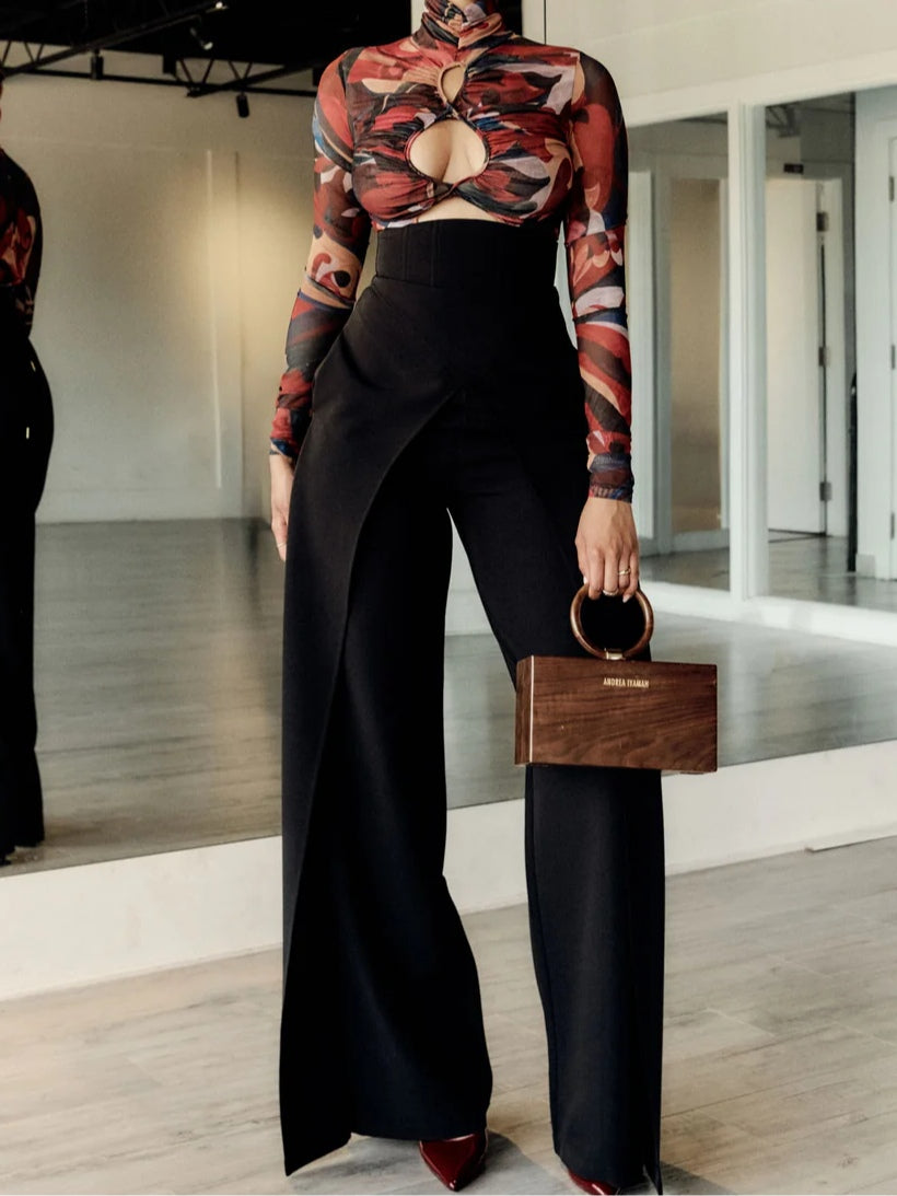 Hollow Crew Neck Short-sleeved Top and Wide-leg Pants Set