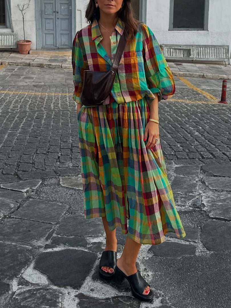 Vintage Colorful Plaid Shirt and Skirt Two-Piece Set