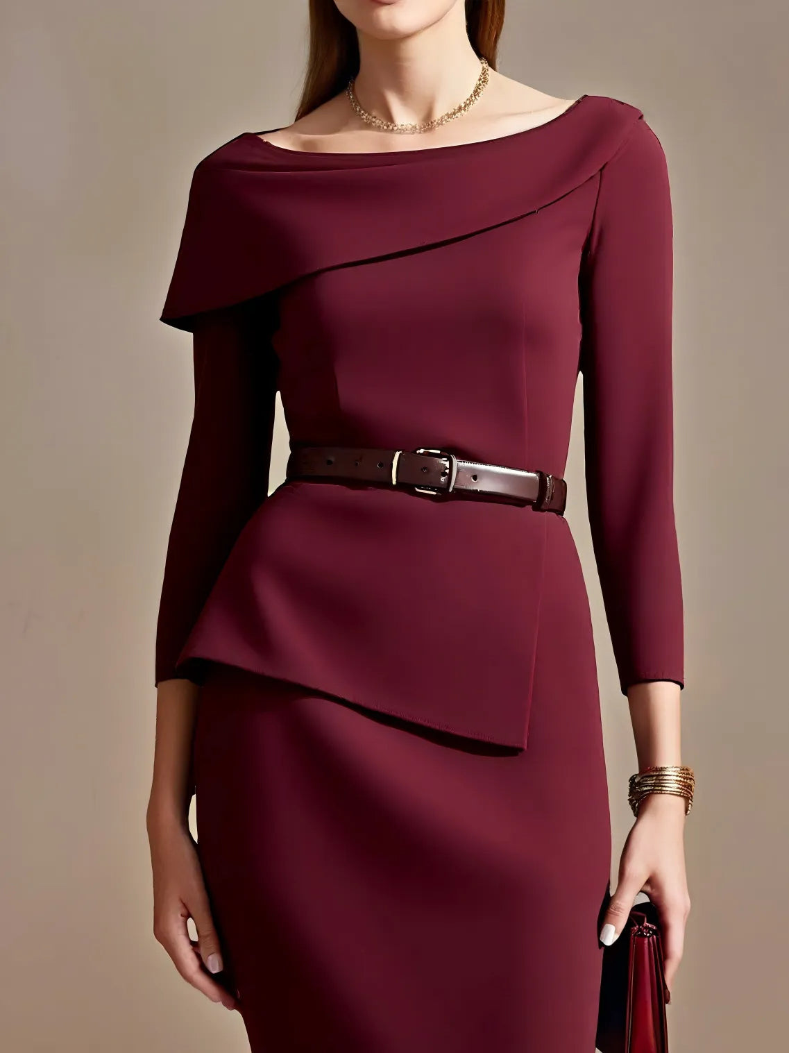 Burgundy Shawl Collar X-Shaped Midi Dress (With Belt)