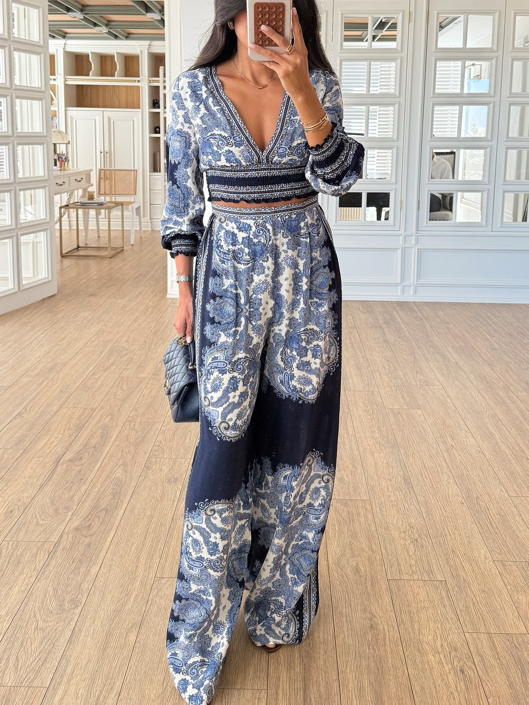 Navy Blue Ethnic Pattern Top And Wide-leg Pants Set